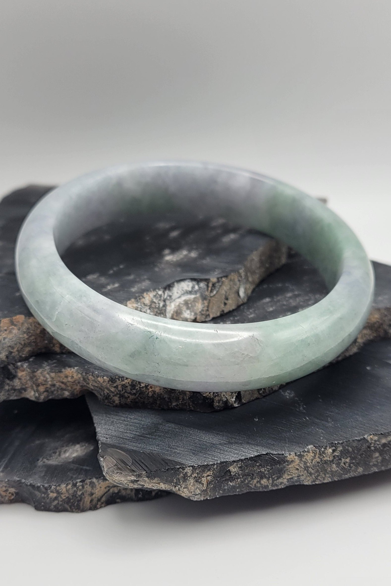 This jade bangle looks so modern and chic - It just jumped out at me! Pale green, white and just a hint of lavender make this bangle something special. It will take a petite hand to wear this one though. We suggest that you measure across your palm just below the knuckles and it should be no more than 2.75" wide. If this bangle were just a bit larger it would easily be twice the price or more.